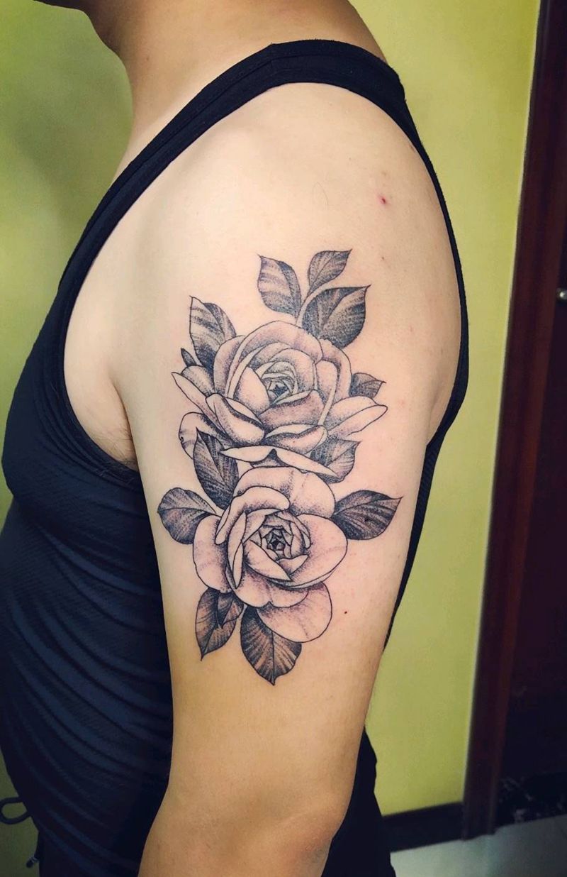 当前位置: 首页 >山西省太原市纹身店-太原翼龙刺青工作室纹身图案>花纹身图片_肩部手臂新传统点刺纹身图案