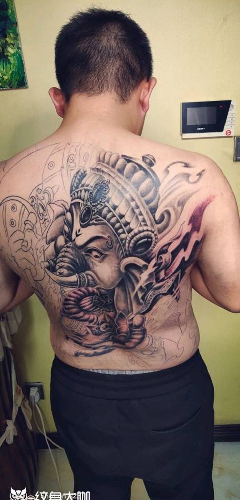 当前位置: 首页 >山西省太原市纹身店-太原翼龙刺青工作室纹身图案>象神纹身图片_背部老传统纹身图案