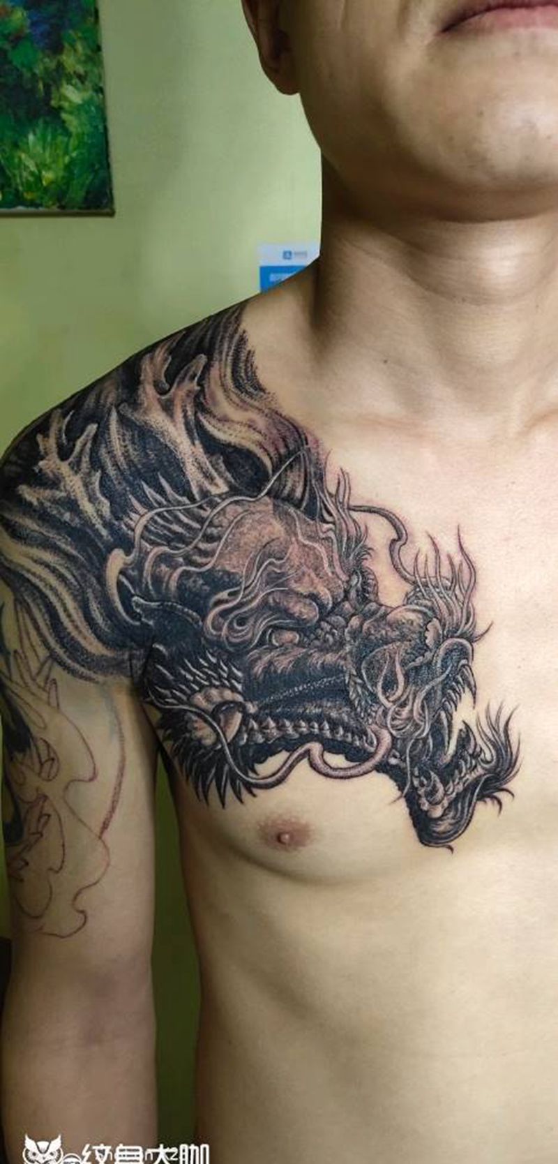 过肩龙纹身图片_肩部胸部点刺新传统纹身图案