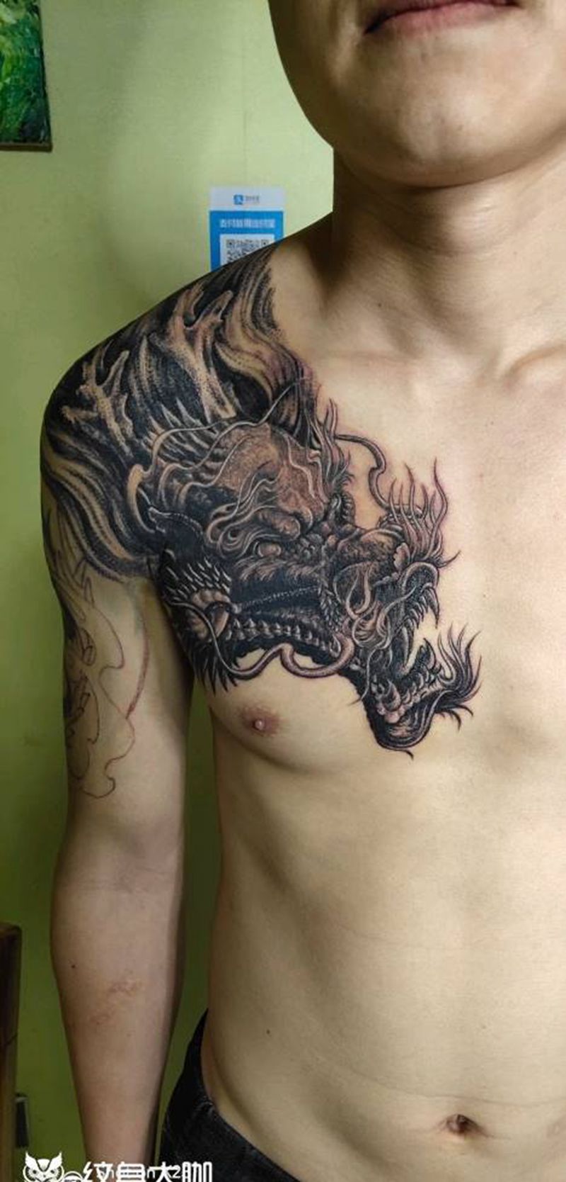 当前位置: 首页 >山西省太原市纹身店-太原翼龙刺青工作室纹身图案>过肩龙纹身图片_肩部胸部点刺新传统纹身图案
