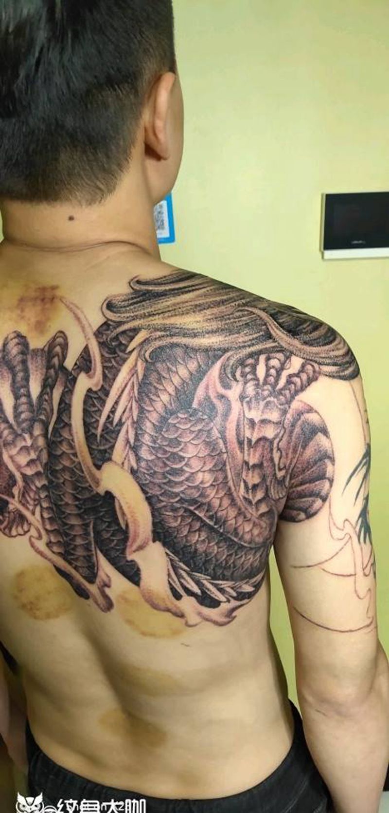 当前位置: 首页 >山西省太原市纹身店-太原翼龙刺青工作室纹身图案>过肩龙纹身图片_肩部胸部点刺新传统纹身图案