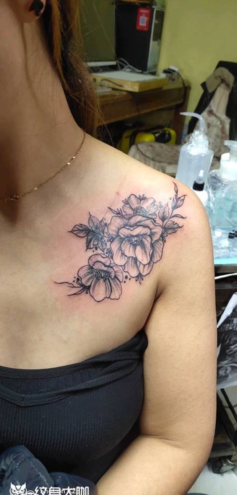 花容月色纹身图片_胸部点刺新传统纹身图案