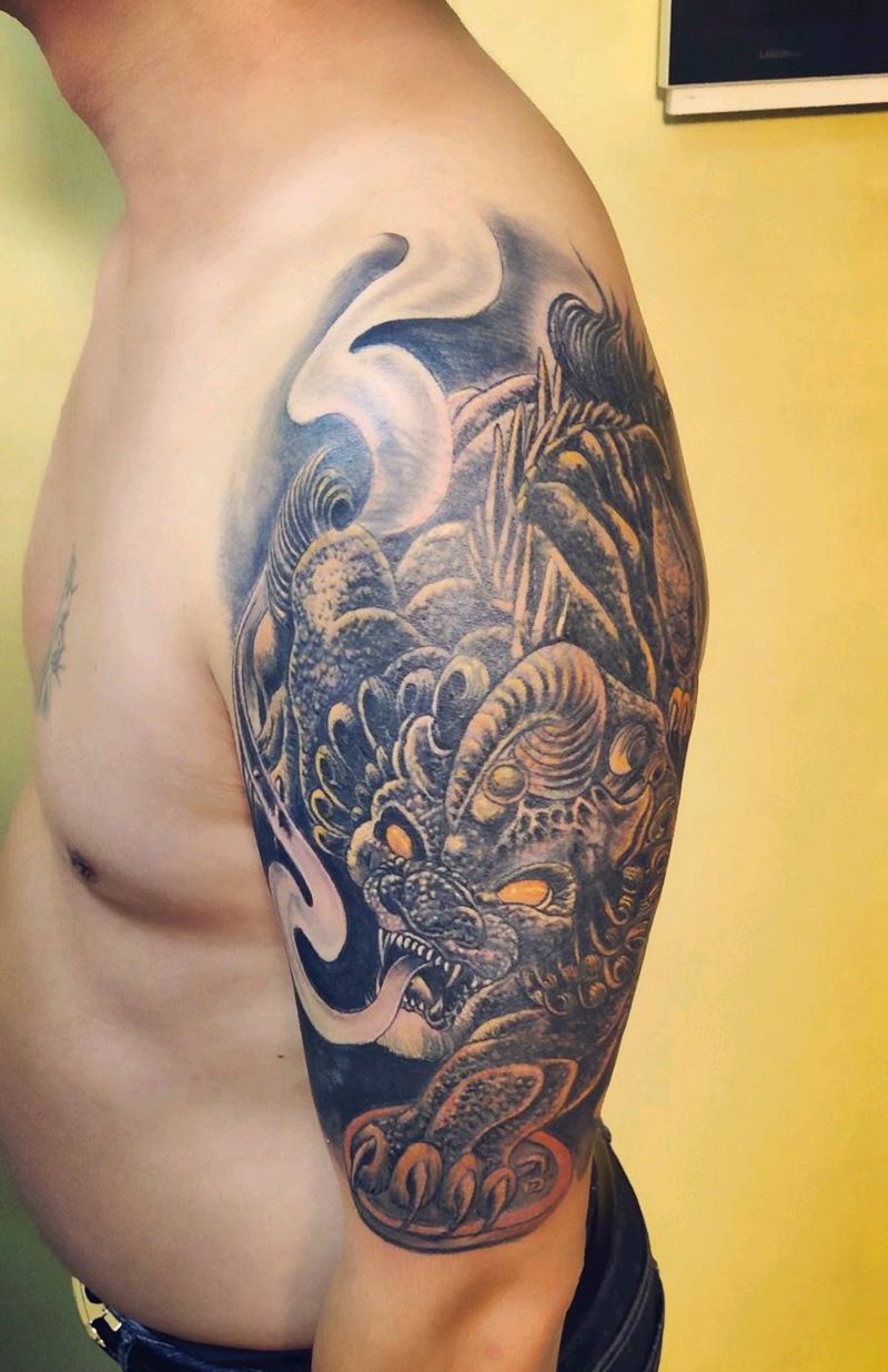 遮盖貔貅纹身图片_手臂肩部新传统纹身图案