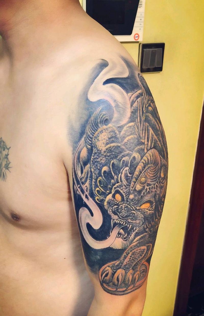 当前位置: 首页 >山西省太原市纹身店-太原翼龙刺青工作室纹身图案>遮盖貔貅纹身图片_手臂肩部新传统纹身图案