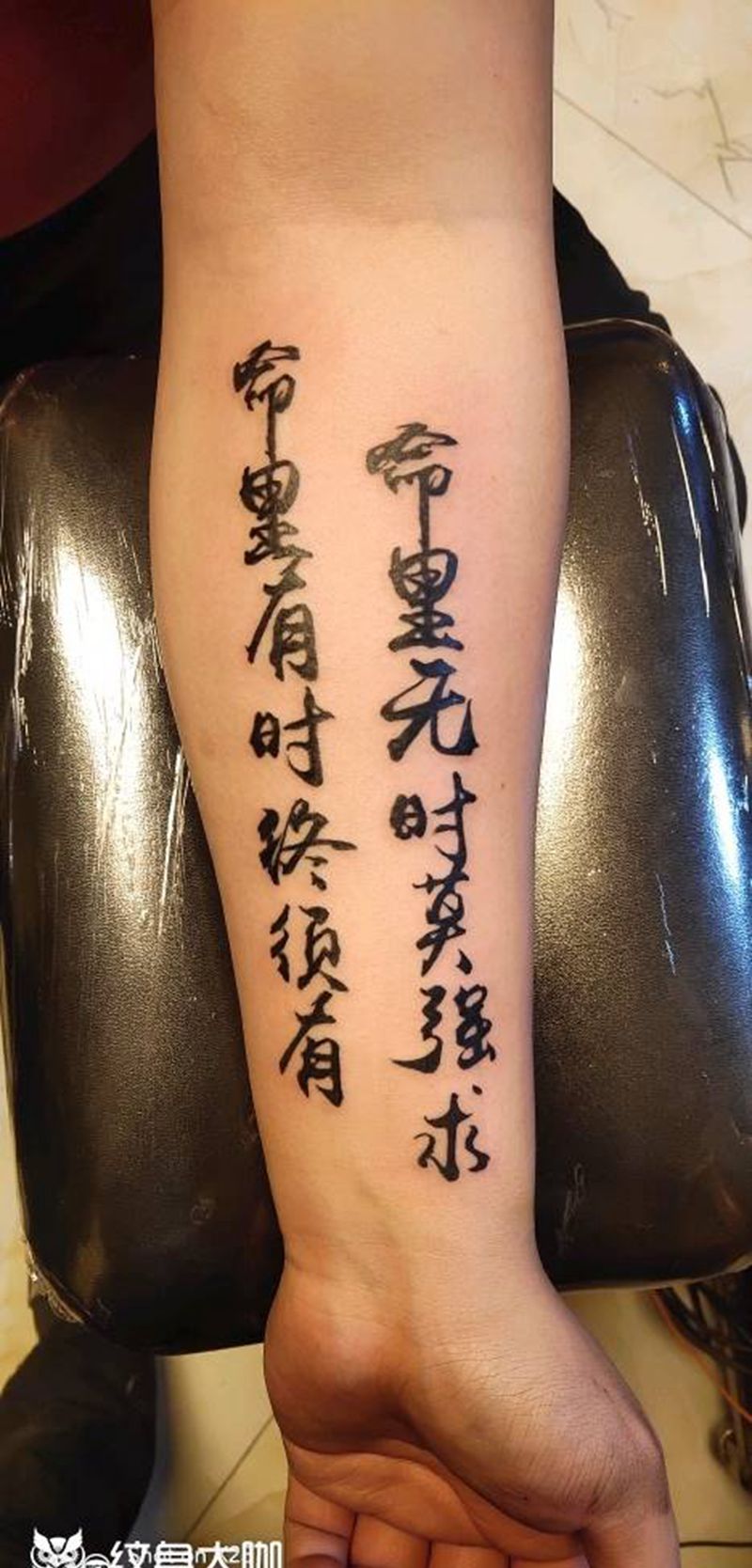 当前位置: 首页 >山西省太原市纹身店-太原翼龙刺青工作室纹身图案>书法字体纹身图片_手臂新传统纹身图案