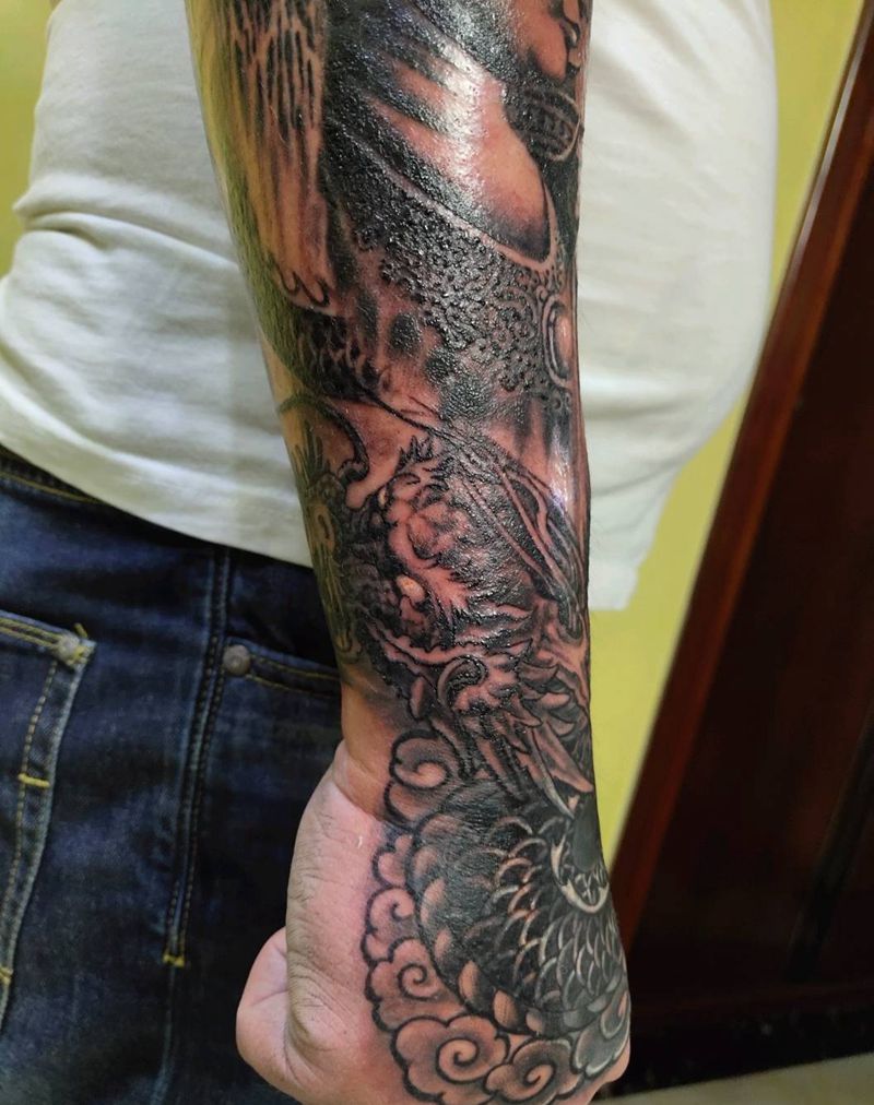 当前位置: 首页 >山西省太原市纹身店-太原翼龙刺青工作室纹身图案>悟道纹身图片_手臂手部新传统遮盖纹身图案