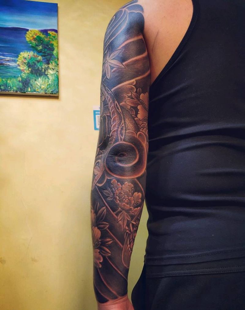 当前位置: 首页 >山西省太原市纹身店-太原翼龙刺青工作室纹身图案>日式老传统花臂遮盖作品!纹身图片_手臂老传统纹身图案