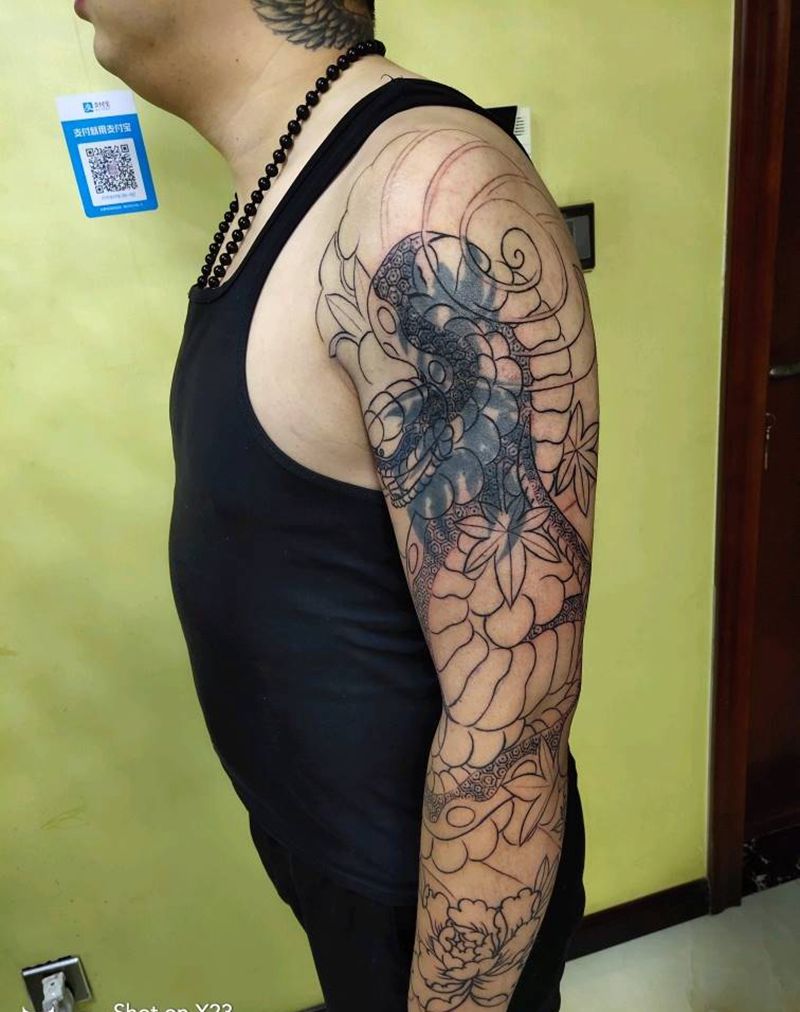 当前位置: 首页 >山西省太原市纹身店-太原翼龙刺青工作室纹身图案>日式老传统花臂遮盖作品!纹身图片_手臂老传统纹身图案