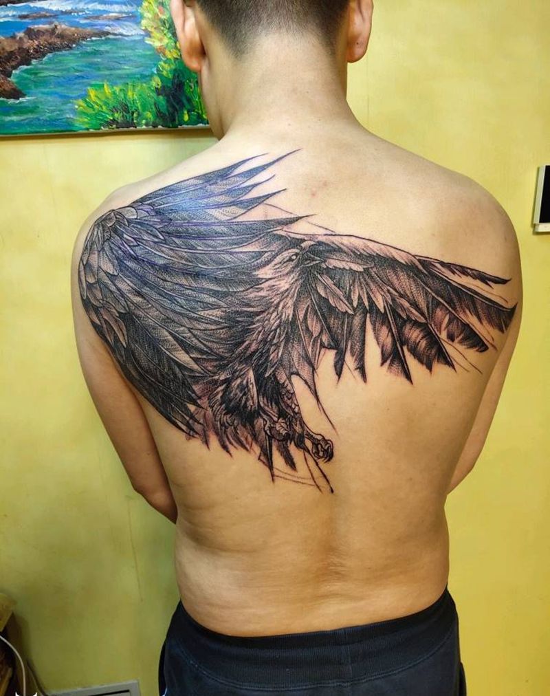 当前位置: 首页 >山西省太原市纹身店-太原翼龙刺青工作室纹身图案>鹰纹身图片_背部点刺新传统纹身图案