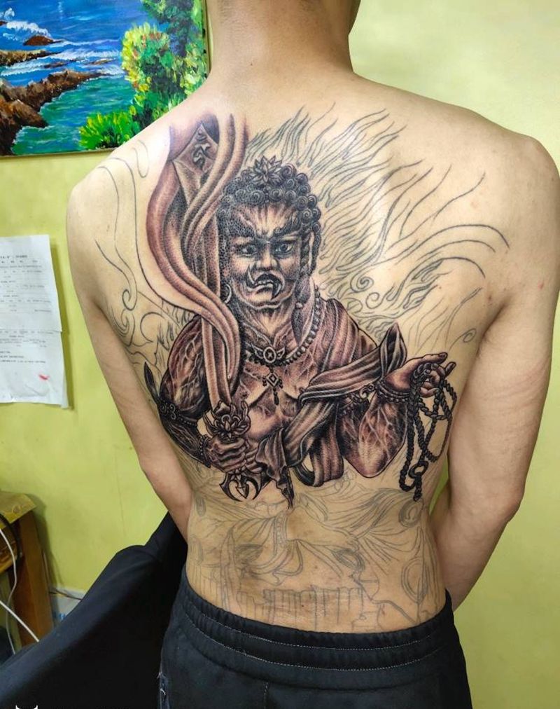 当前位置: 首页 >山西省太原市纹身店-太原翼龙刺青工作室纹身图案>不动明王纹身图片_背部老传统纹身图案