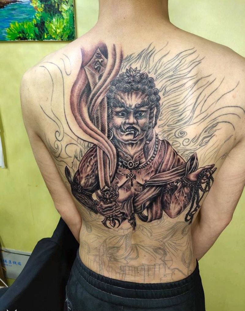 当前位置: 首页 >山西省太原市纹身店-太原翼龙刺青工作室纹身图案>不动明王纹身图片_背部老传统纹身图案