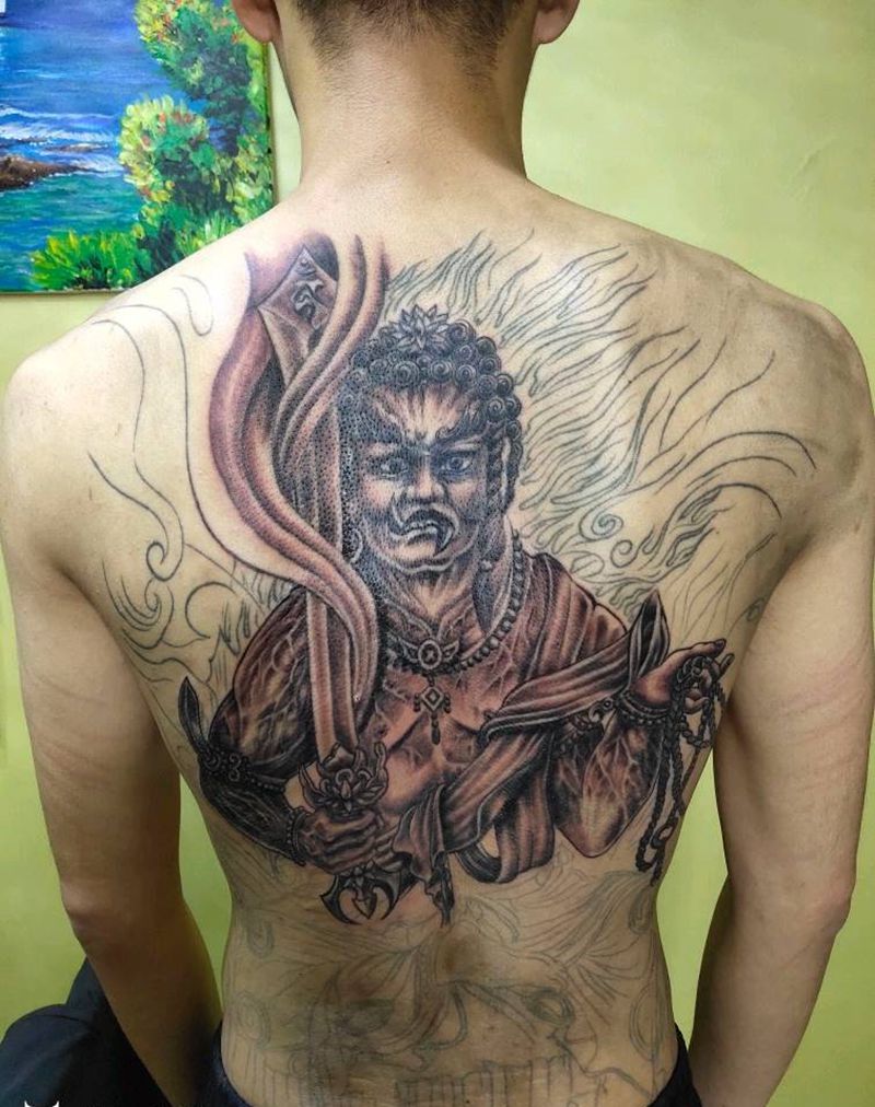 当前位置: 首页 >山西省太原市纹身店-太原翼龙刺青工作室纹身图案>不动明王纹身图片_背部老传统纹身图案