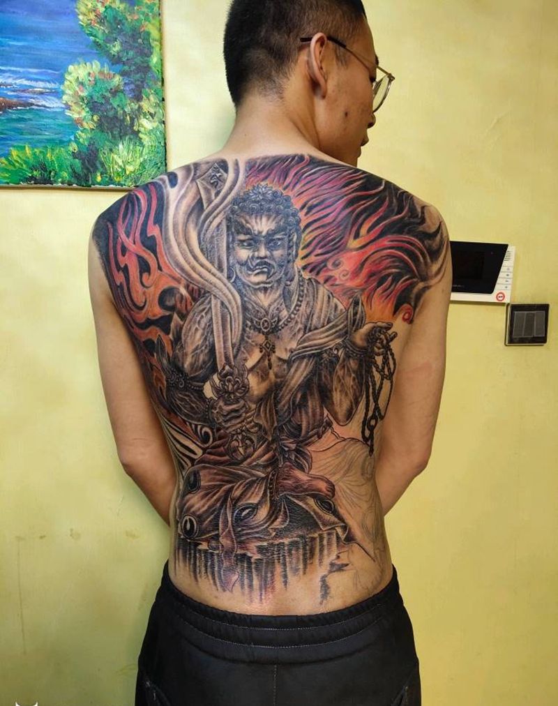 当前位置: 首页 >山西省太原市纹身店-太原翼龙刺青工作室纹身图案>不动明王纹身图片_背部老传统纹身图案