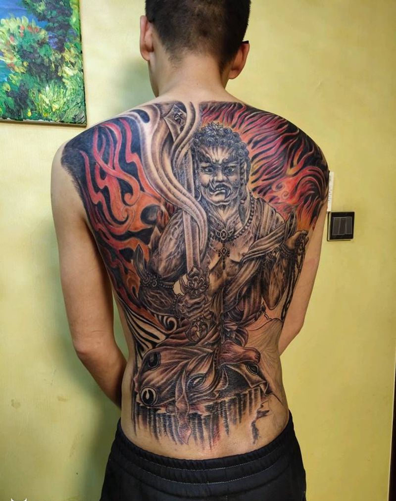 当前位置: 首页 >山西省太原市纹身店-太原翼龙刺青工作室纹身图案>不动明王纹身图片_背部老传统纹身图案