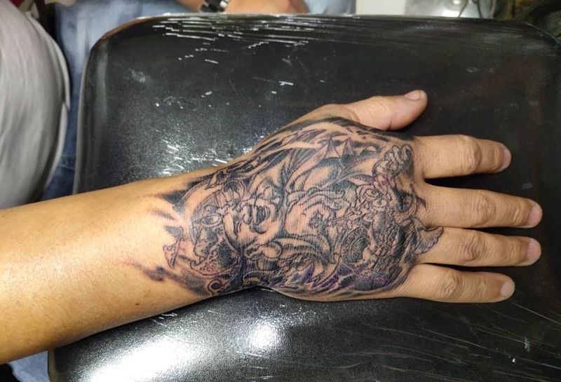 当前位置: 首页 >山西省太原市纹身店-太原翼龙刺青工作室纹身图案>财神纹身图片_手部手臂新传统纹身图案