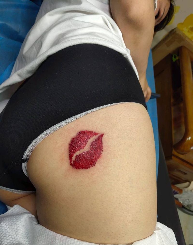 当前位置: 首页 >山西省太原市纹身店-太原翼龙刺青工作室纹身图案>唇印纹身图片_臀部新传统New School纹身图案