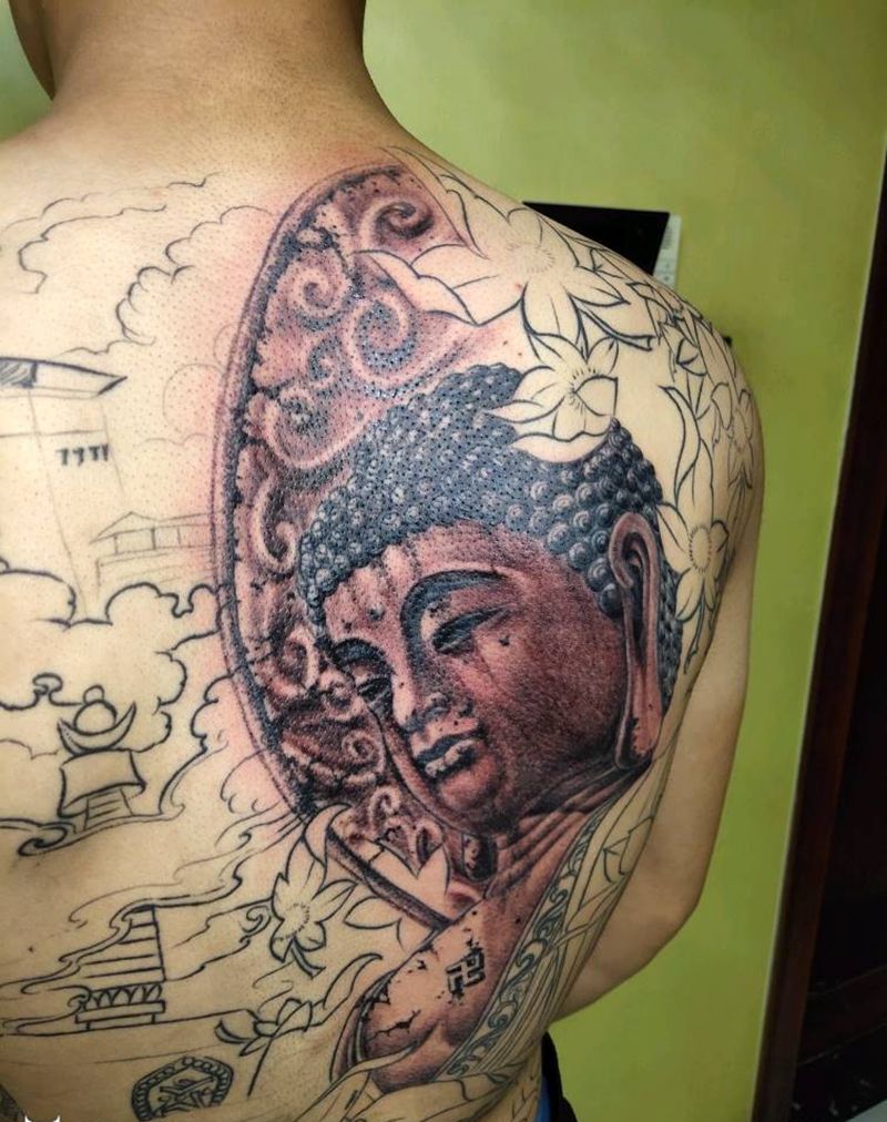石雕佛纹身图片_背部新传统点刺纹身图案