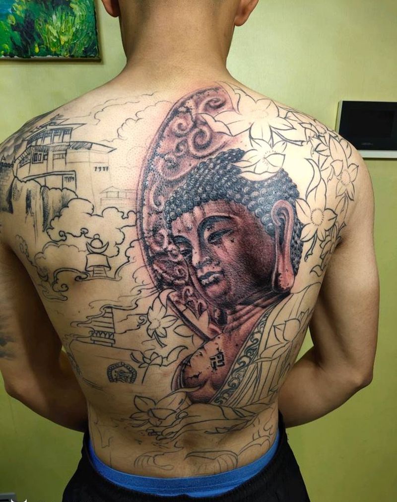 石雕佛纹身图片_背部新传统点刺纹身图案