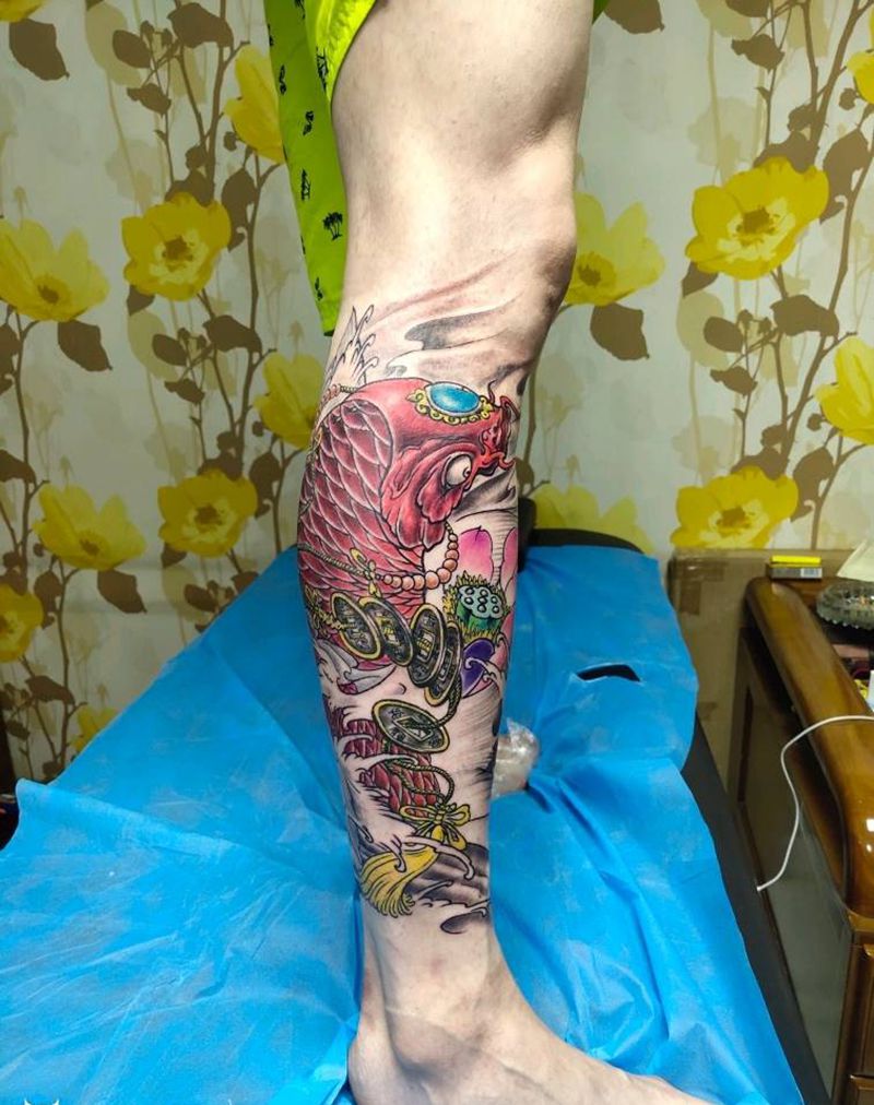 当前位置: 首页 >山西省太原市纹身店-太原翼龙刺青工作室纹身图案>招财鱼纹身图片_腿部新传统水彩纹身图案