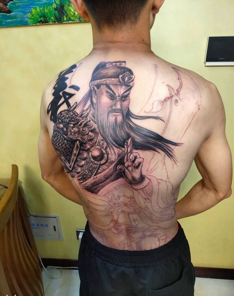 当前位置: 首页 >山西省太原市纹身店-太原翼龙刺青工作室纹身图案>满背关公绝版纹身图片_背部新传统纹身图案