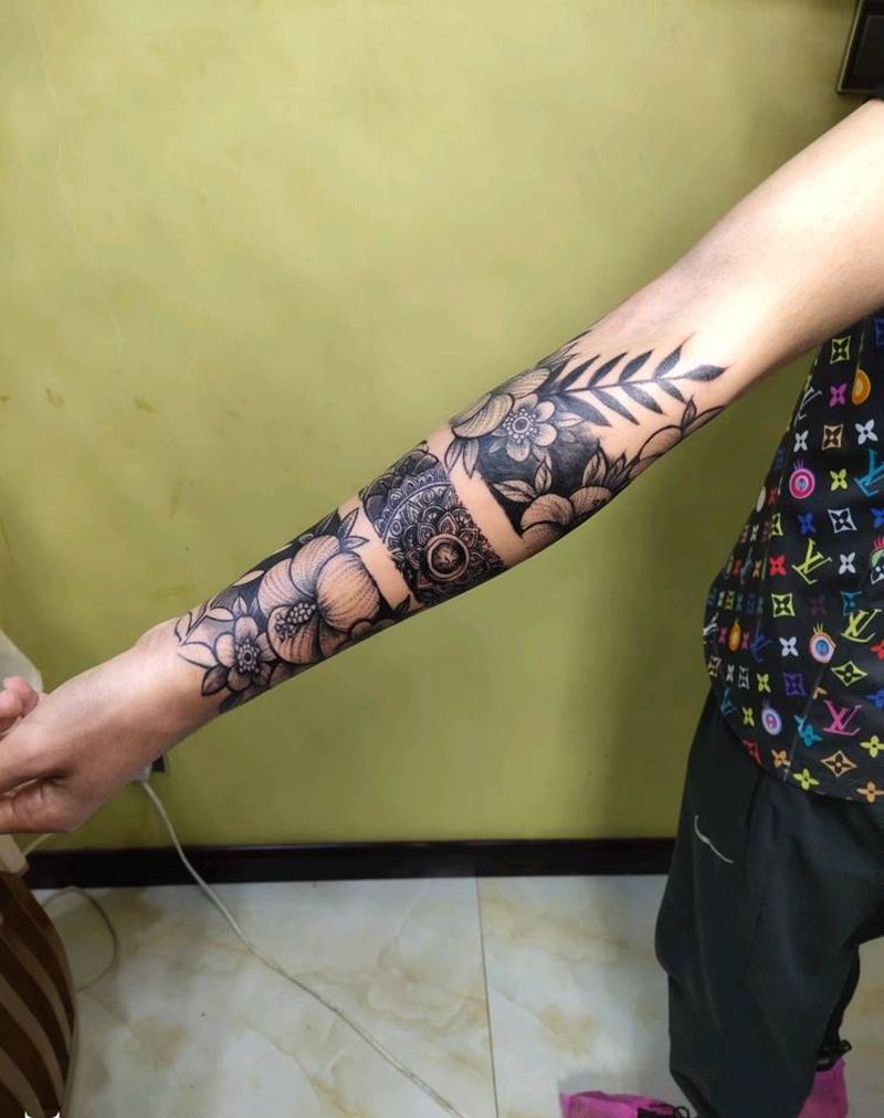 素花花臂纹身图片_手臂新传统点刺纹身图案