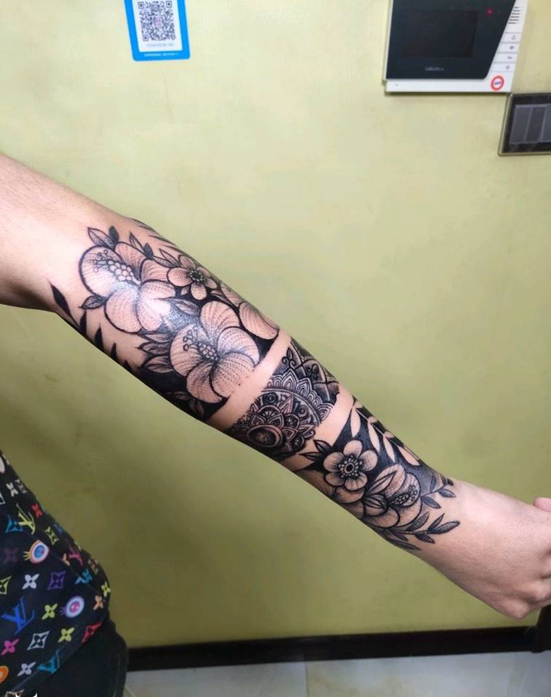 素花花臂纹身图片_手臂新传统点刺纹身图案