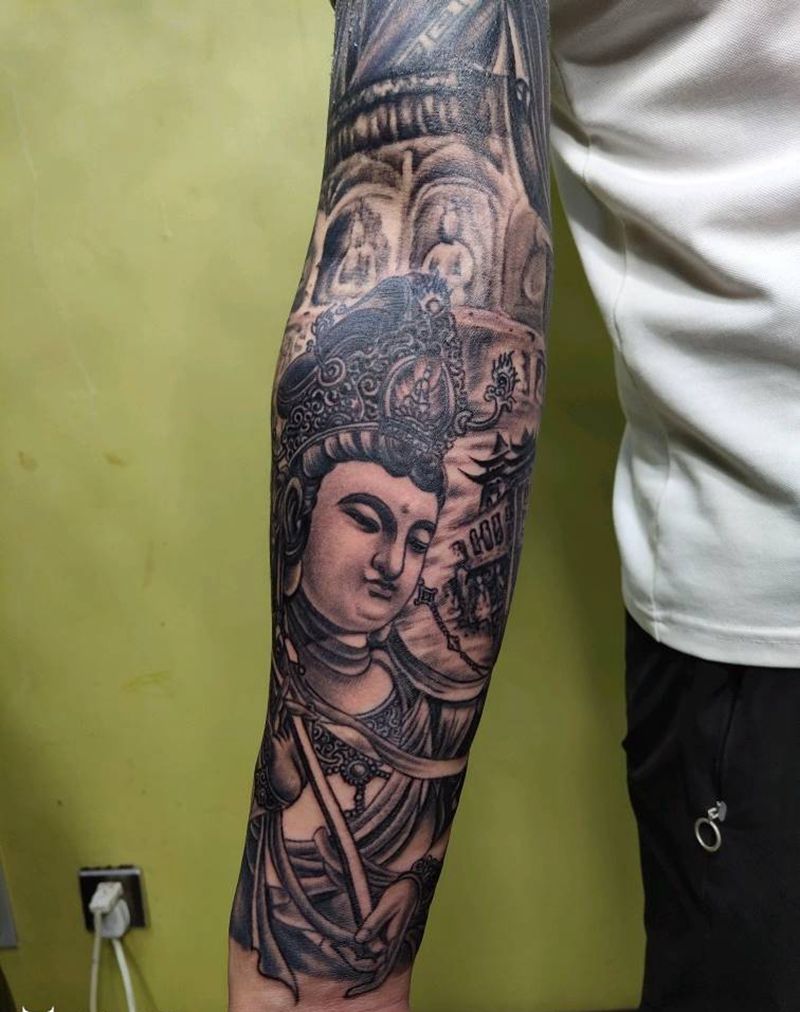 当前位置: 首页 >山西省太原市纹身店-太原翼龙刺青工作室纹身图案>普贤菩萨纹身图片_手臂新传统纹身图案