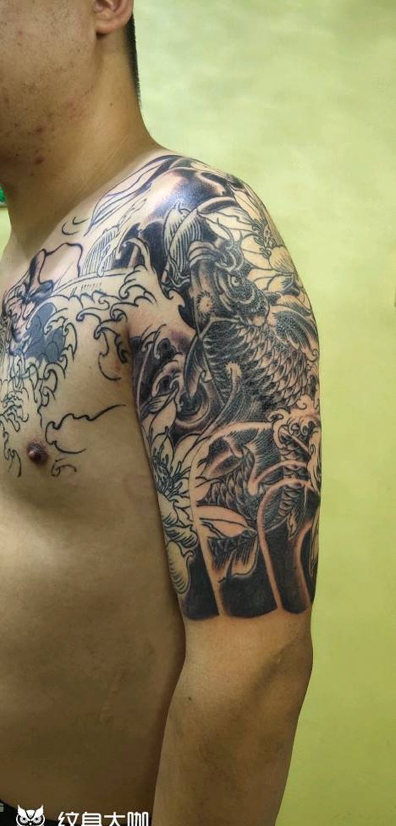 半甲鱼纹身图片_胸部肩部老传统纹身图案
