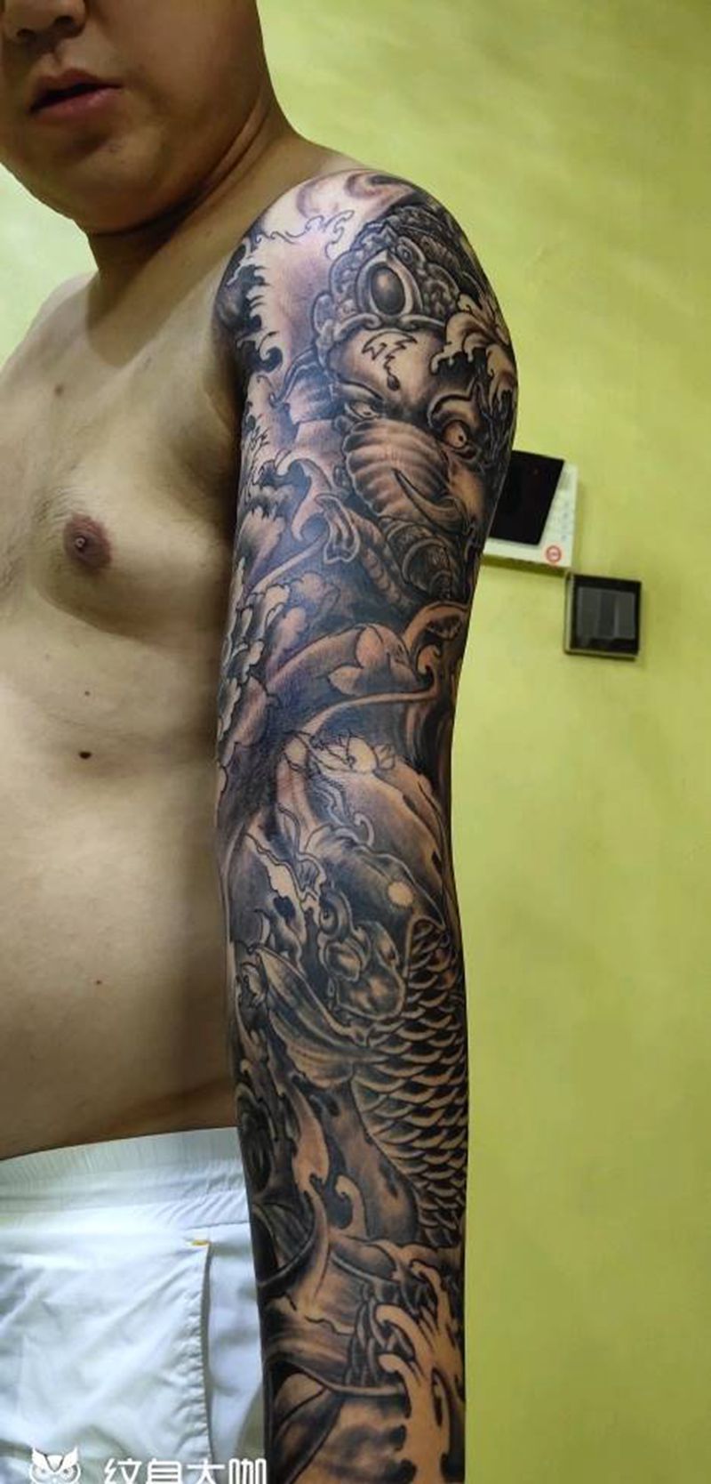 当前位置: 首页 >山西省太原市纹身店-太原翼龙刺青工作室纹身图案>象神锦鲤花荷花臂纹身图片_手臂新传统纹身图案