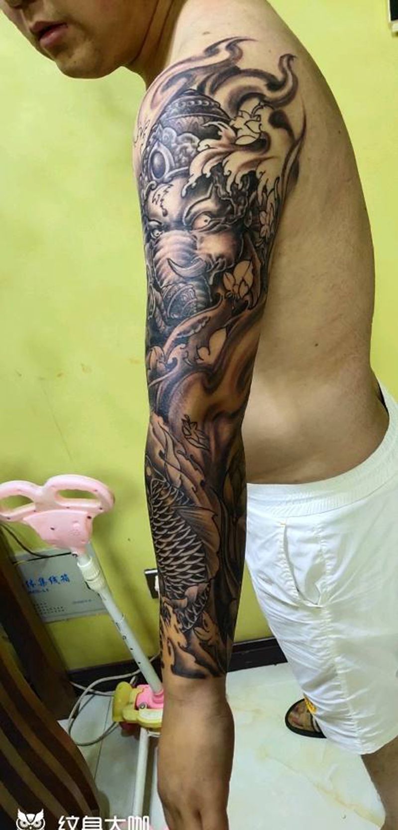 当前位置: 首页 >山西省太原市纹身店-太原翼龙刺青工作室纹身图案>象神锦鲤花荷花臂纹身图片_手臂新传统纹身图案