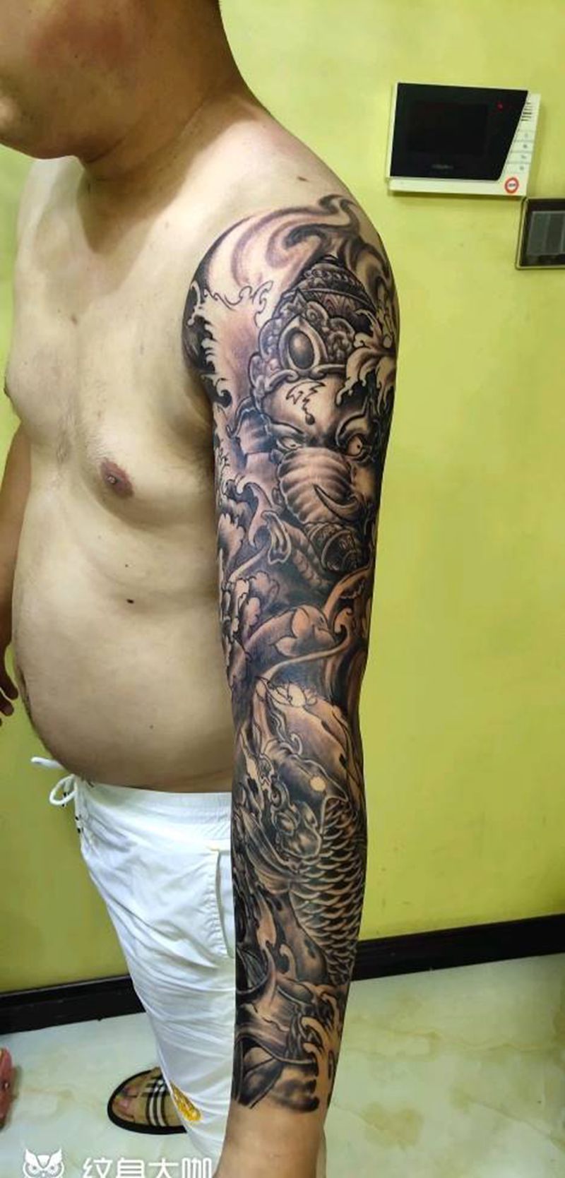 当前位置: 首页 >山西省太原市纹身店-太原翼龙刺青工作室纹身图案>象神锦鲤花荷花臂纹身图片_手臂新传统纹身图案