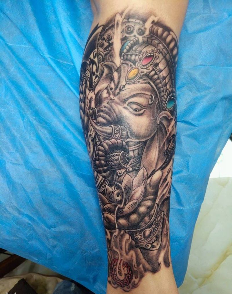 当前位置: 首页 >山西省太原市纹身店-太原翼龙刺青工作室纹身图案>象神纹身图片_腿部新传统纹身图案