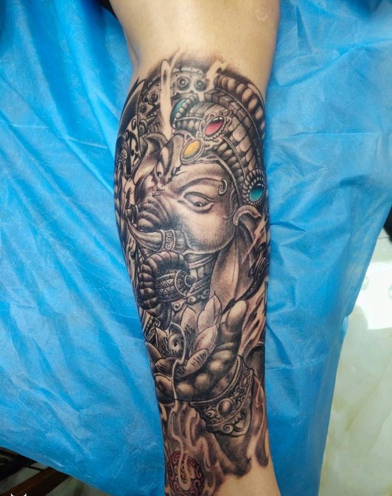 当前位置: 首页 >山西省太原市纹身店-太原翼龙刺青工作室纹身图案>象神纹身图片_腿部新传统纹身图案