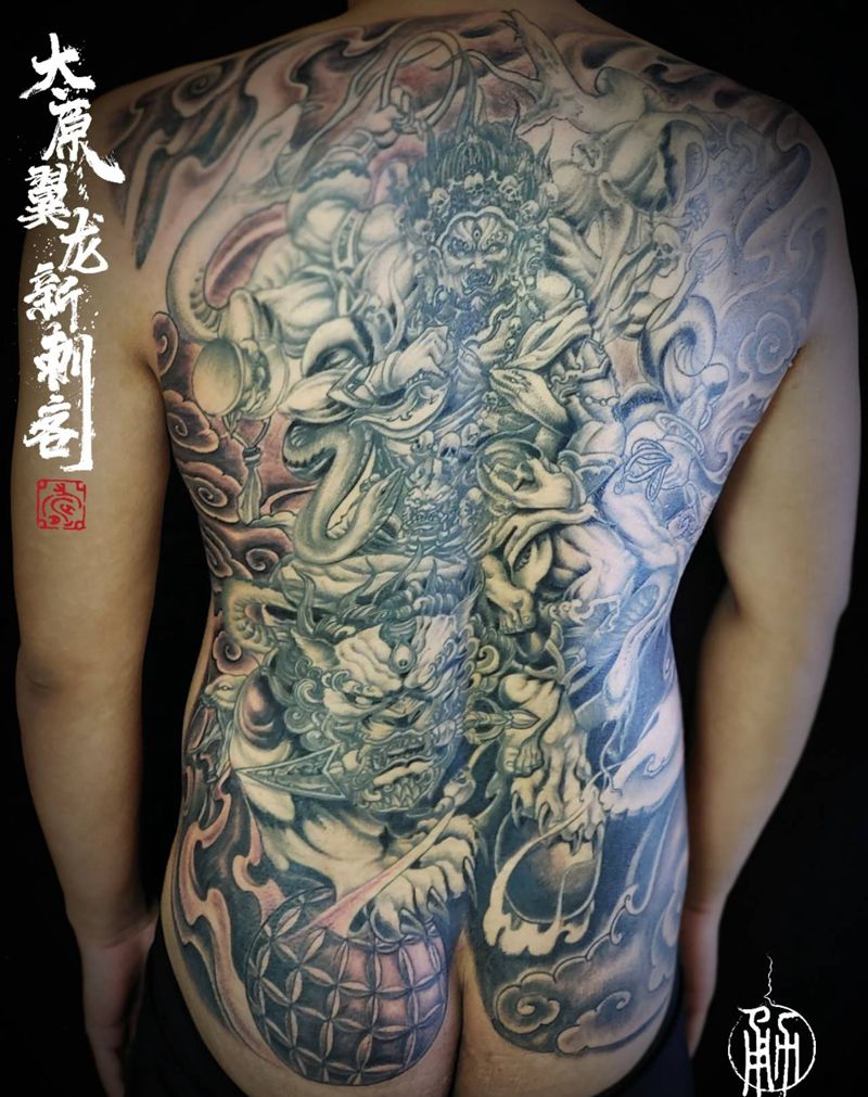 当前位置: 首页 >山西省太原市纹身店-太原翼龙刺青工作室纹身图案>本店加边改成大满背纹身图片_背部新传统纹身图案