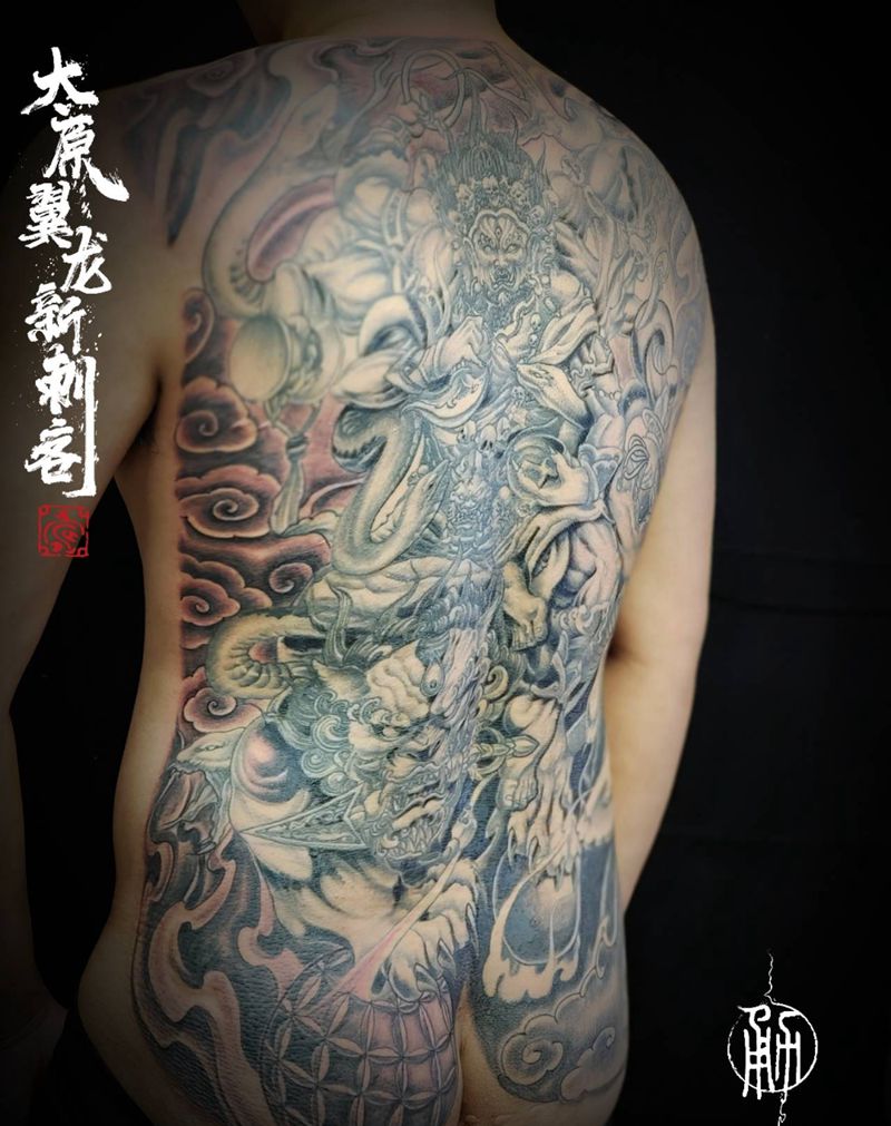 当前位置: 首页 >山西省太原市纹身店-太原翼龙刺青工作室纹身图案>本店加边改成大满背纹身图片_背部新传统纹身图案