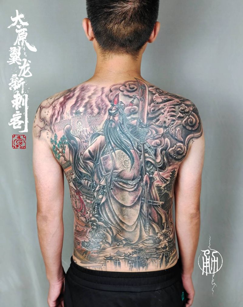 当前位置: 首页 >山西省太原市纹身店-太原翼龙刺青工作室纹身图案>满背关公纹身图片_背部新传统纹身图案