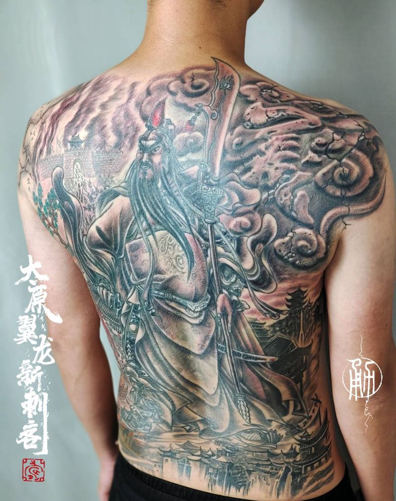 当前位置: 首页 >山西省太原市纹身店-太原翼龙刺青工作室纹身图案>满背关公纹身图片_背部新传统纹身图案