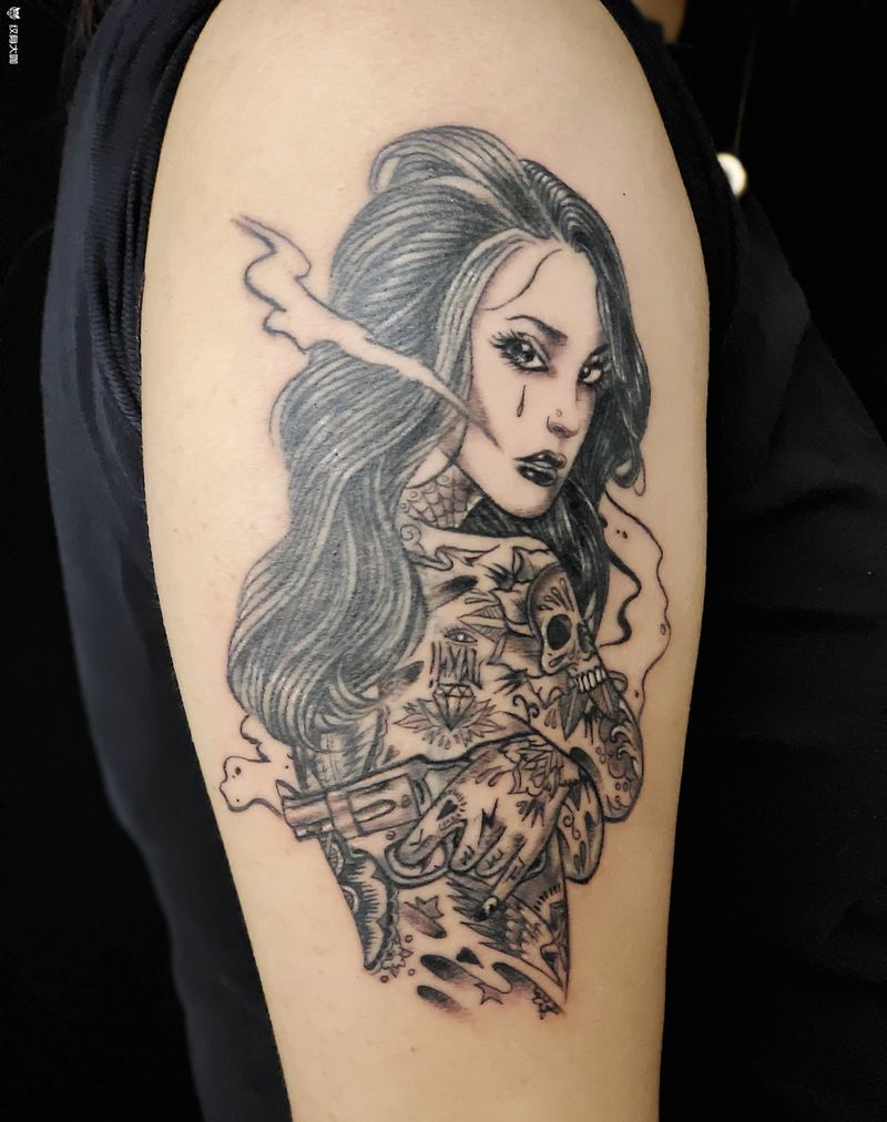 当前位置: 首页 >山西省太原市纹身店-太原翼龙刺青工作室纹身图案>欧美美女纹身图片_手臂新传统纹身图案