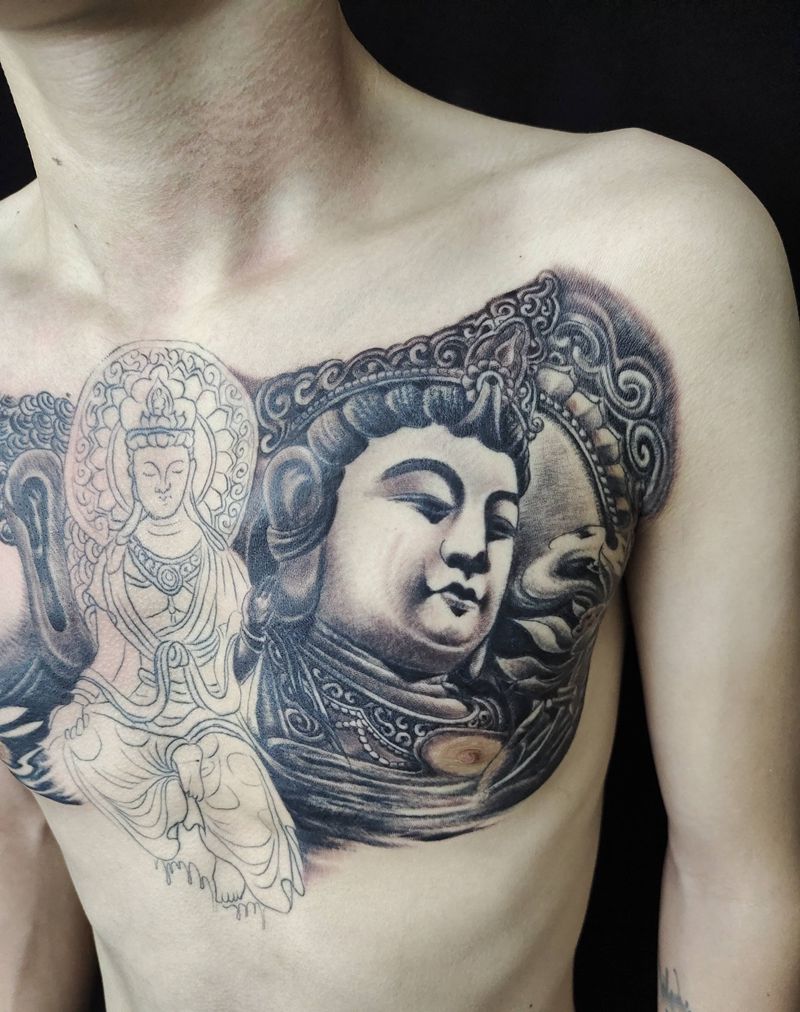 三面佛未完成纹身图片_胸部新传统纹身图案