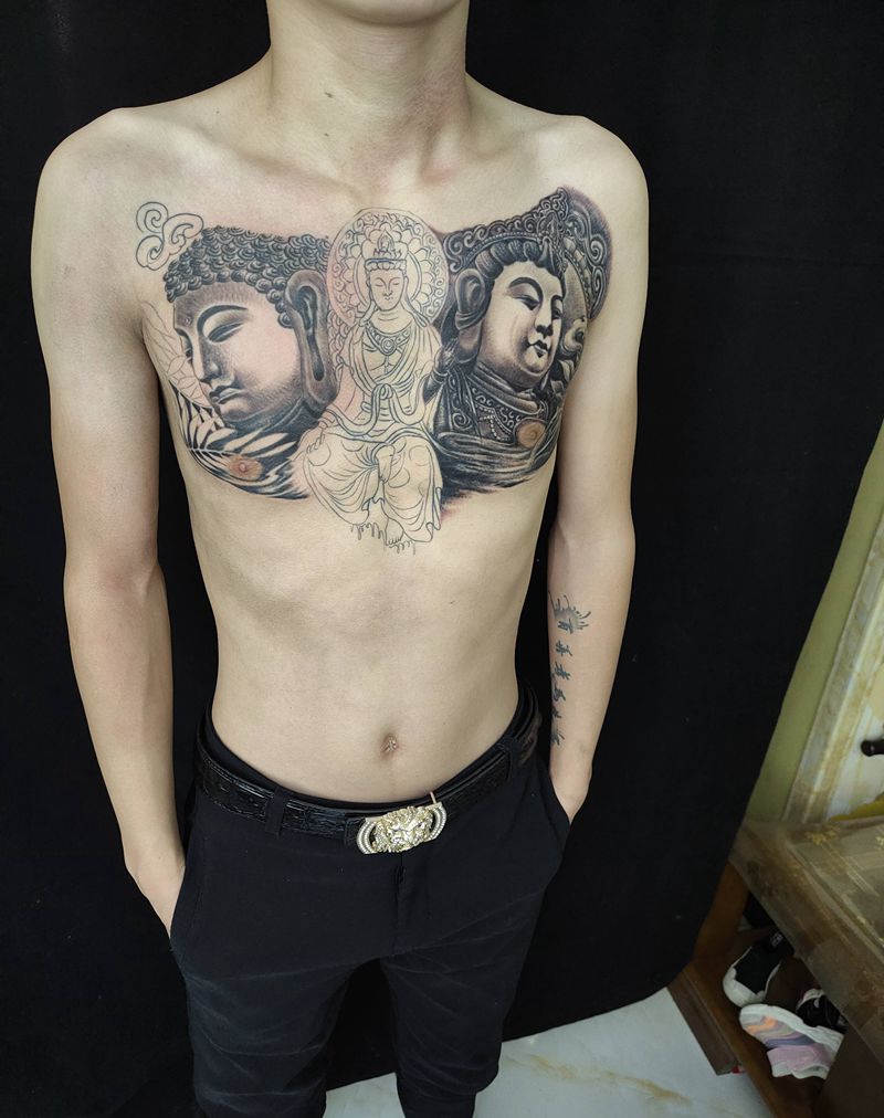 三面佛未完成纹身图片_胸部新传统纹身图案