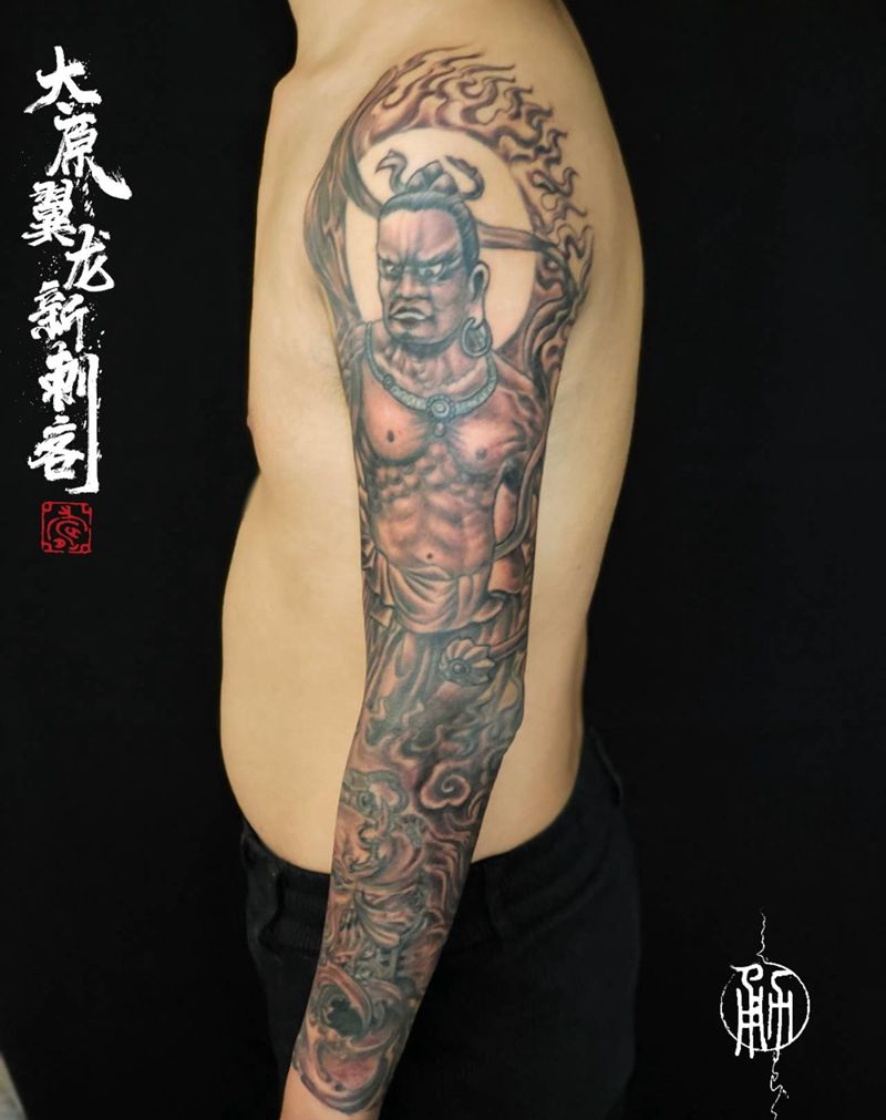 当前位置: 首页 >山西省太原市纹身店-太原翼龙刺青工作室纹身图案>不动明王花臂纹身图片_手臂新传统纹身图案