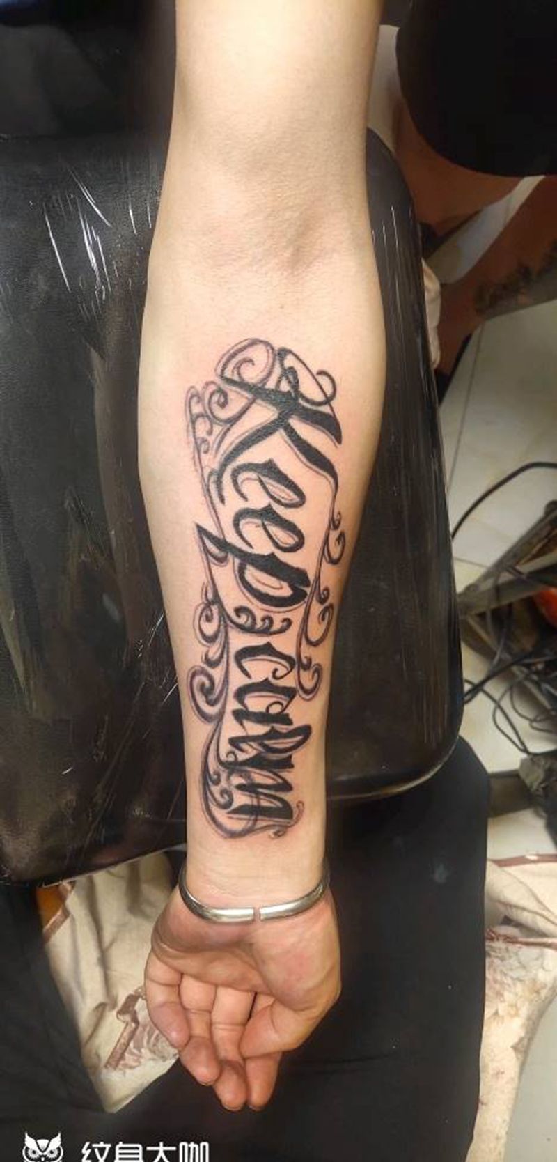 当前位置: 首页 >山西省太原市纹身店-太原翼龙刺青工作室纹身图案>花体字纹身图片_手臂花体字纹身图案