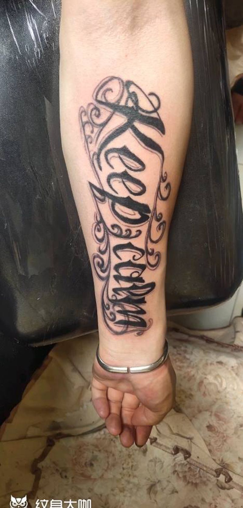 当前位置: 首页 >山西省太原市纹身店-太原翼龙刺青工作室纹身图案>花体字纹身图片_手臂花体字纹身图案