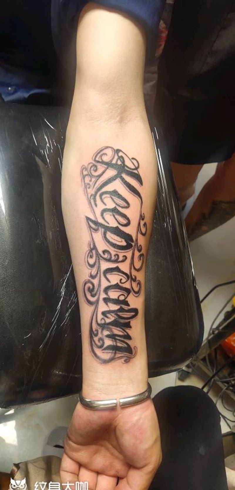 当前位置: 首页 >山西省太原市纹身店-太原翼龙刺青工作室纹身图案>花体字纹身图片_手臂花体字纹身图案