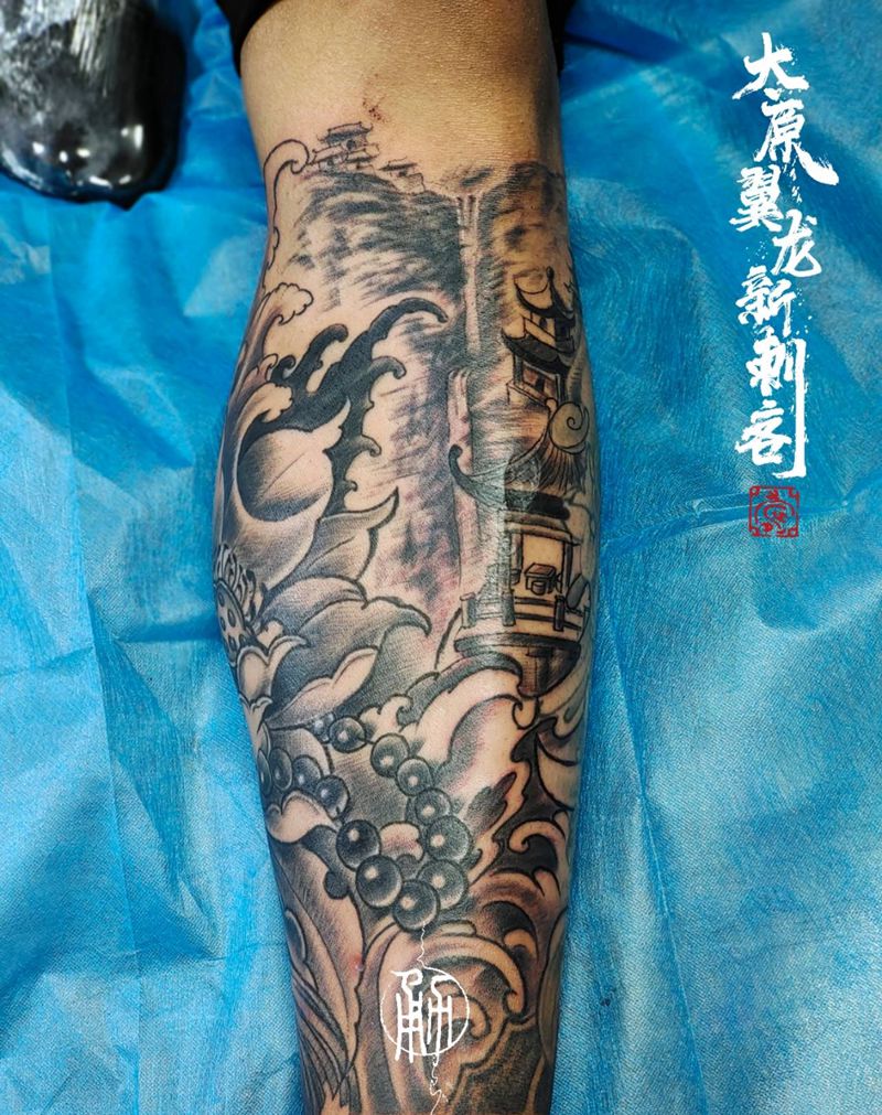 当前位置: 首页 >山西省太原市纹身店-太原翼龙刺青工作室纹身图案>小腿侧包纹身图片_腿部新传统纹身图案