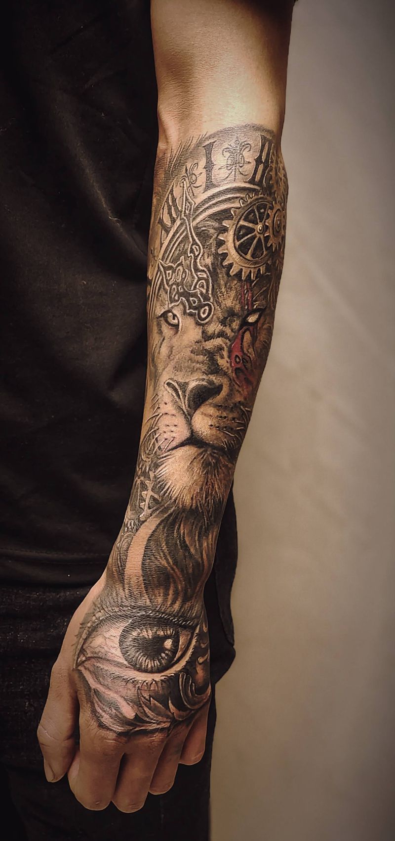 当前位置: 首页 >山西省太原市纹身店-太原翼龙刺青工作室纹身图案>雄狮包小臂纹身图片_手臂欧美写实纹身图案
