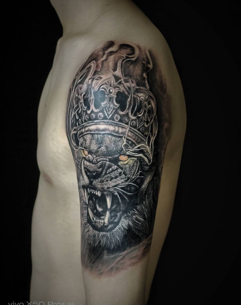 当前位置: 首页 >山西省太原市纹身店-太原翼龙刺青工作室纹身图案>狮王纹身图片_手臂欧美写实纹身图案
