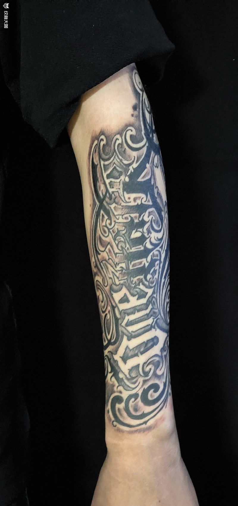当前位置: 首页 >山西省太原市纹身店-太原翼龙刺青工作室纹身图案>花体字纹身图片_手臂花体字纹身图案