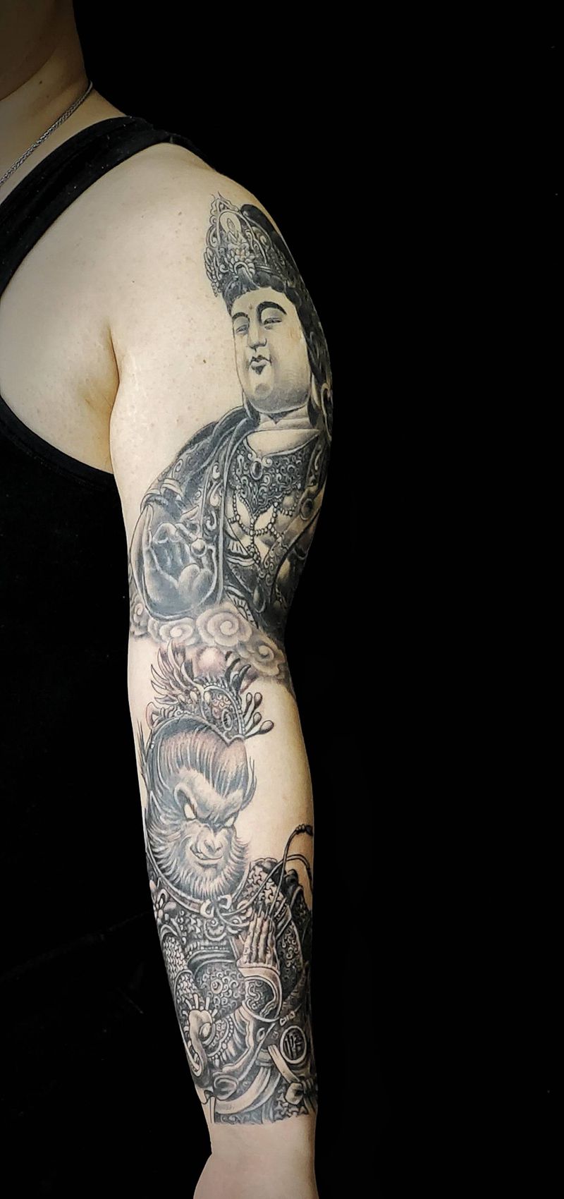 当前位置: 首页 >山西省太原市纹身店-太原翼龙刺青工作室纹身图案>悟空一拜纹身图片_手臂新传统纹身图案