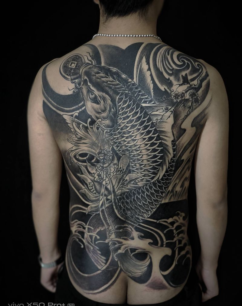 当前位置: 首页 >山西省太原市纹身店-太原翼龙刺青工作室纹身图案>满背招财鱼纹身图片_背部老传统纹身图案